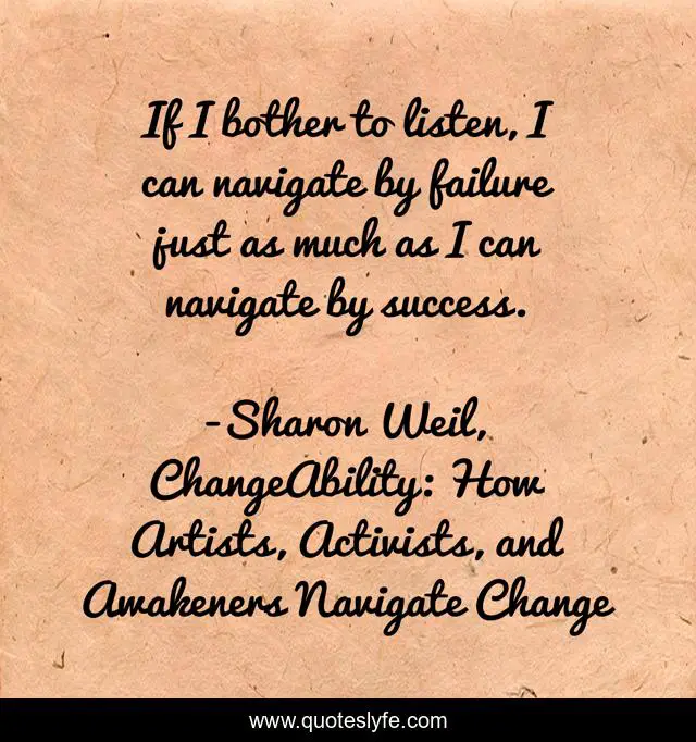 This page presents the quote "If I bother to listen, I can navigate by failure just as much as I can navigate by success.". Author of this quote is Sharon Weil, ChangeAbility: How Artists, Activists, and Awakeners Navigate Change. This quote is about move-on, success, deep-listening, failure, mistakes, navigate-change, listening, learn, be-the-change,.