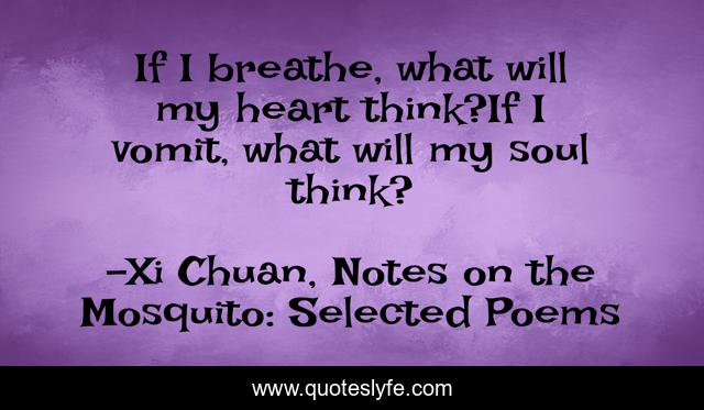 This page presents the quote "If I breathe, what will my heart think?If I vomit, what will my soul think?". Author of this quote is Xi Chuan, Notes on the Mosquito: Selected Poems. This quote is about heart, philosophical, soul, xi-chuan,.