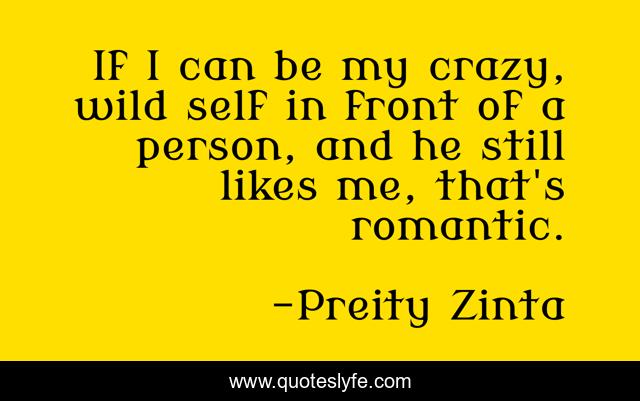 This page presents the quote "If I can be my crazy, wild self in front of a person, and he still likes me, that's romantic.". Author of this quote is Preity Zinta. This quote is about me, self, crazy,.