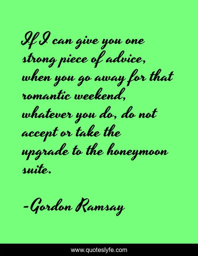This page presents the quote "If I can give you one strong piece of advice, when you go away for that romantic weekend, whatever you do, do not accept or take the upgrade to the honeymoon suite.". Author of this quote is Gordon Ramsay. This quote is about advice, strong,.