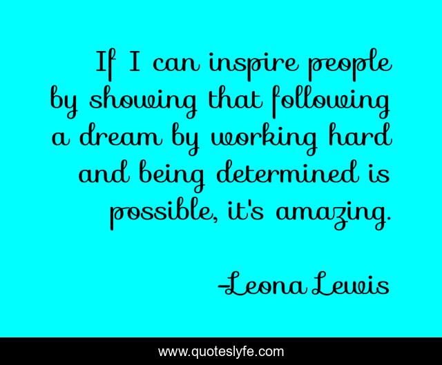 This page presents the quote "If I can inspire people by showing that following a dream by working hard and being determined is possible, it's amazing.". Author of this quote is Leona Lewis. This quote is about working hard, inspire,.