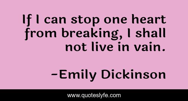This page presents the quote "If I can stop one heart from breaking, I shall not live in vain.". Author of this quote is Emily Dickinson. This quote is about life, love, affection,.