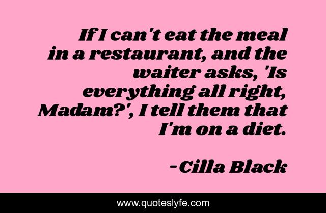 This page presents the quote "If I can't eat the meal in a restaurant, and the waiter asks, 'Is everything all right, Madam?', I tell them that I'm on a diet.". Author of this quote is Cilla Black. This quote is about right, restaurant,.