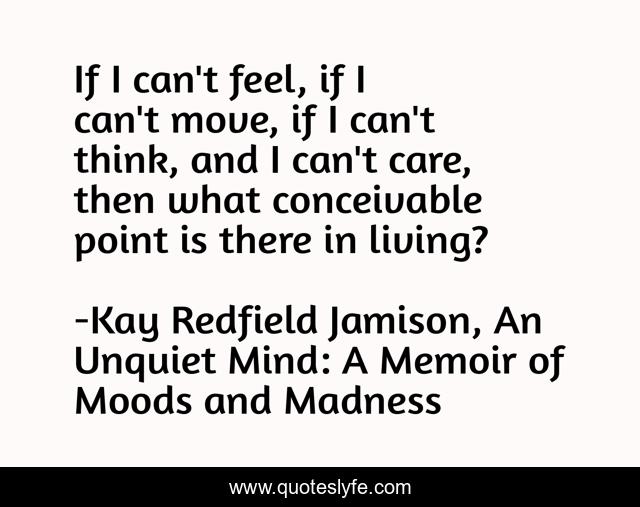 This page presents the quote "If I can't feel, if I can't move, if I can't think, and I can't care, then what conceivable point is there in living?". Author of this quote is Kay Redfield Jamison, An Unquiet Mind: A Memoir of Moods and Madness. This quote is about mood-disorders, bipolar-disorder, depression,.
