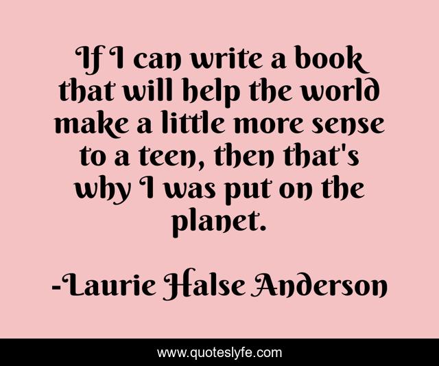 This page presents the quote "If I can write a book that will help the world make a little more sense to a teen, then that's why I was put on the planet.". Author of this quote is Laurie Halse Anderson. This quote is about world, book, help,.