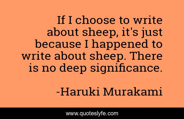 This page presents the quote "If I choose to write about sheep, it's just because I happened to write about sheep. There is no deep significance.". Author of this quote is Haruki Murakami. This quote is about japanese-fiction, author,.