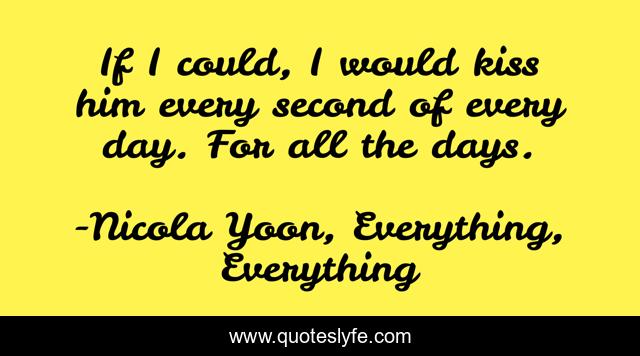 This page presents the quote "If I could, I would kiss him every second of every day. For all the days.". Author of this quote is Nicola Yoon, Everything, Everything. This quote is about young-adult-fiction, kiss,.