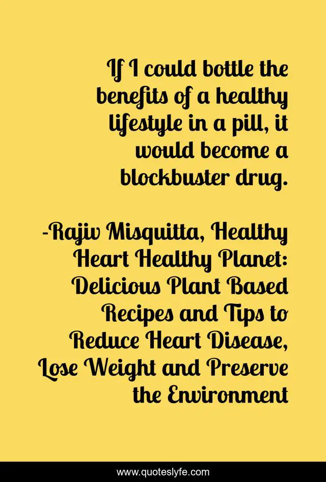 This page presents the quote "If I could bottle the benefits of a healthy lifestyle in a pill, it would become a blockbuster drug.". Author of this quote is Rajiv Misquitta, Healthy Heart Healthy Planet: Delicious Plant Based Recipes and Tips to Reduce Heart Disease, Lose Weight and Preserve the Environment. This quote is about healthy-diet, healthy, healthy-living, health-care, health, health-and-fitness,.