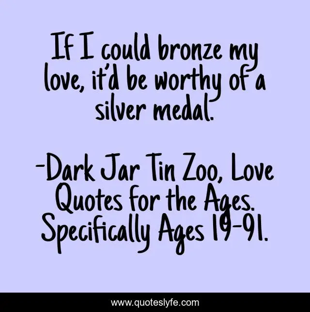 This page presents the quote "If I could bronze my love, it’d be worthy of a silver medal.". Author of this quote is Dark Jar Tin Zoo, Love Quotes for the Ages. Specifically Ages 19-91.. This quote is about funny, love, silver-medal, value, word-junkies, bronze, worthy, humor, comedy,.