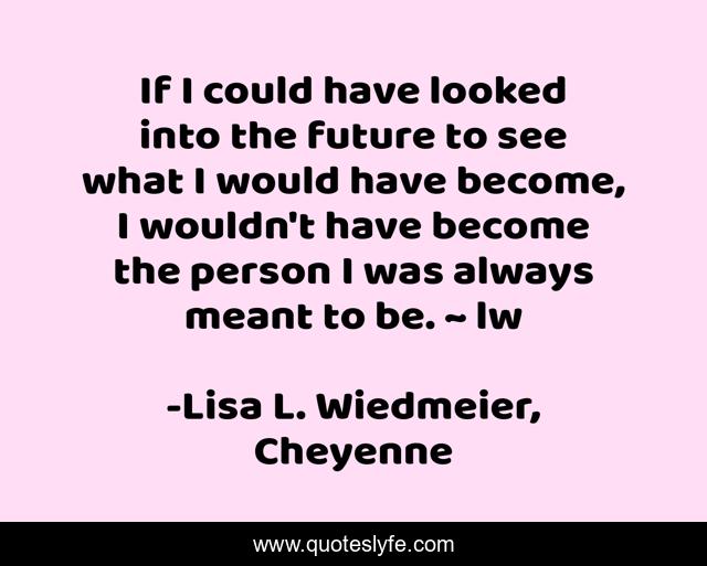 This page presents the quote "If I could have looked into the future to see what I would have become, I wouldn't have become the person I was always meant to be. ~ lw". Author of this quote is Lisa L. Wiedmeier, Cheyenne. This quote is about romance, fantasy, young-adult-fiction,.