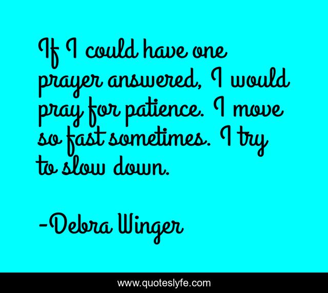 This page presents the quote "If I could have one prayer answered, I would pray for patience. I move so fast sometimes. I try to slow down.". Author of this quote is Debra Winger. This quote is about try, slow, prayer,.