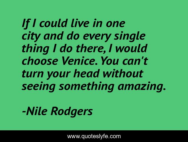 This page presents the quote "If I could live in one city and do every single thing I do there, I would choose Venice. You can't turn your head without seeing something amazing.". Author of this quote is Nile Rodgers. This quote is about city, live,.