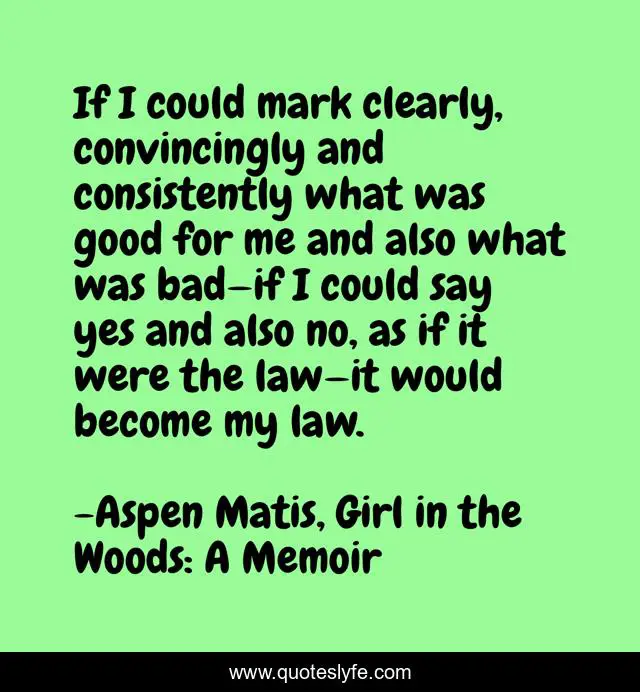 This page presents the quote "If I could mark clearly, convincingly and consistently what was good for me and also what was bad—if I could say yes and also no, as if it were the law—it would become my law.". Author of this quote is Aspen Matis, Girl in the Woods: A Memoir. This quote is about empowerment, aspen-matis, girl-in-the-woods, hiking, women,.