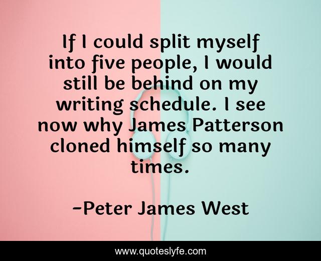 This page presents the quote "If I could split myself into five people, I would still be behind on my writing schedule. I see now why James Patterson cloned himself so many times.". Author of this quote is Peter James West. This quote is about humor, humour, the-writer-s-journey, inspirational, enthusiasm, indie-author,.
