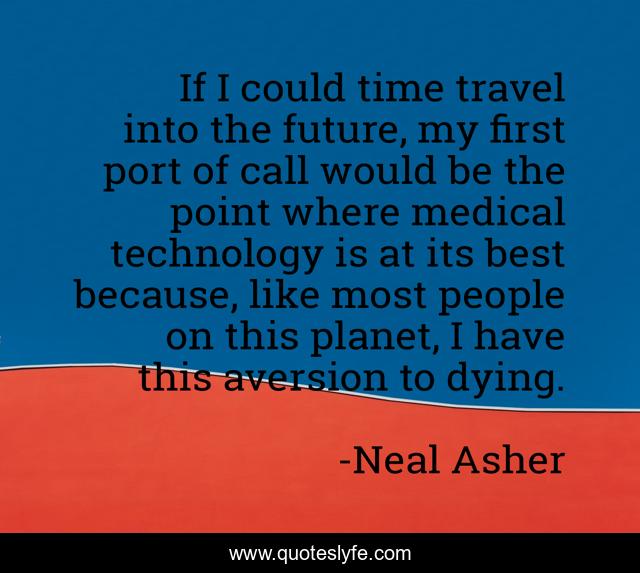 This page presents the quote "If I could time travel into the future, my first port of call would be the point where medical technology is at its best because, like most people on this planet, I have this aversion to dying.". Author of this quote is Neal Asher. This quote is about travel, technology, time,.