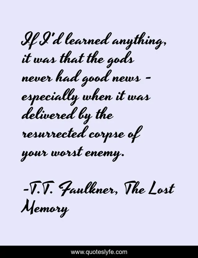 This page presents the quote "If I'd learned anything, it was that the gods never had good news - especially when it was delivered by the resurrected corpse of your worst enemy.". Author of this quote is T.T. Faulkner, The Lost Memory. This quote is about fantasy, gods,.
