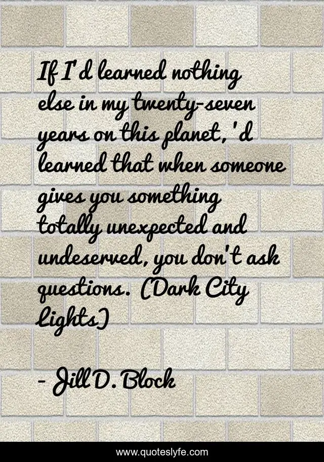 This page presents the quote "If I'd learned nothing else in my twenty-seven years on this planet, 'd learned that when someone gives you something totally unexpected and undeserved, you don't ask questions. (Dark City Lights)". Author of this quote is Jill D. Block. This quote is about anthologies, life, life-lessons, philosophy, gift-of-life, gifts, short-stories, learning, philosophy-of-life,.