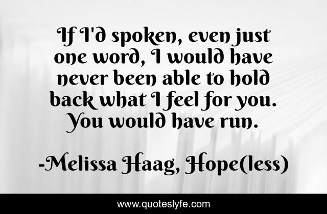 This page presents the quote "If I'd spoken, even just one word, I would have never been able to hold back what I feel for you. You would have run.". Author of this quote is Melissa Haag, Hope(less). This quote is about sweet, love, affection,.