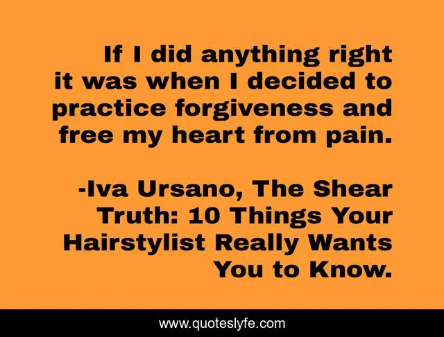 This page presents the quote "If I did anything right it was when I decided to practice forgiveness and free my heart from pain.". Author of this quote is Iva Ursano, The Shear Truth: 10 Things Your Hairstylist Really Wants You to Know.. This quote is about heartache, forgiveness, heartbreak, love, affection,.