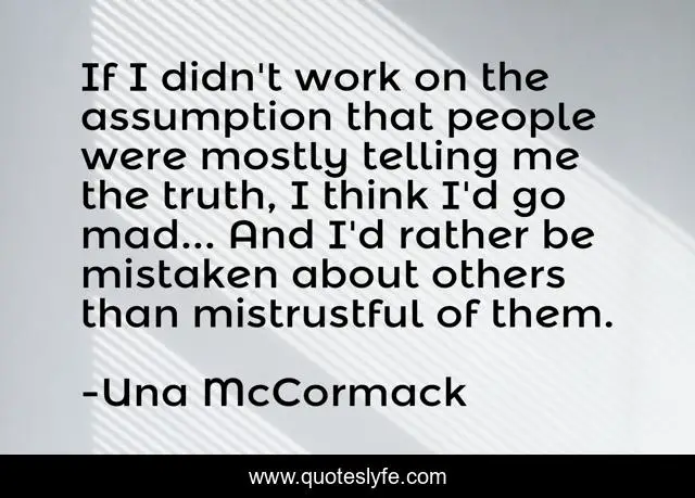 This page presents the quote "If I didn't work on the assumption that people were mostly telling me the truth, I think I'd go mad... And I'd rather be mistaken about others than mistrustful of them.". Author of this quote is Una McCormack. This quote is about enthusiasm, trust, inspirational, truth, people,.