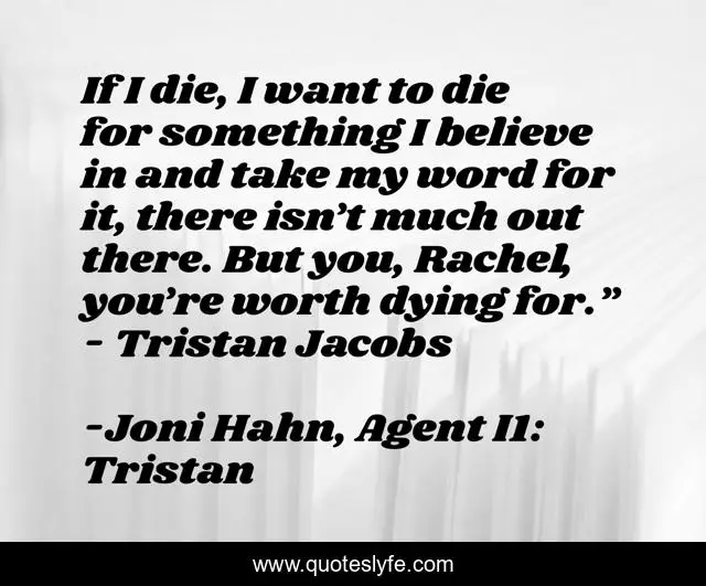 This page presents the quote "If I die, I want to die for something I believe in and take my word for it, there isn’t much out there. But you, Rachel, you’re worth dying for.” - Tristan Jacobs". Author of this quote is Joni Hahn, Agent I1: Tristan. This quote is about navy-seals, superhero, sci-fi, agent, romance, mercenary,.