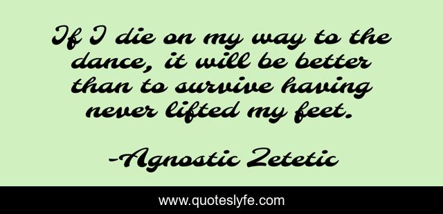 This page presents the quote "If I die on my way to the dance, it will be better than to survive having never lifted my feet.". Author of this quote is Agnostic Zetetic. This quote is about life, death, risk, accident, dance, survival, choice, live, inhibition,.