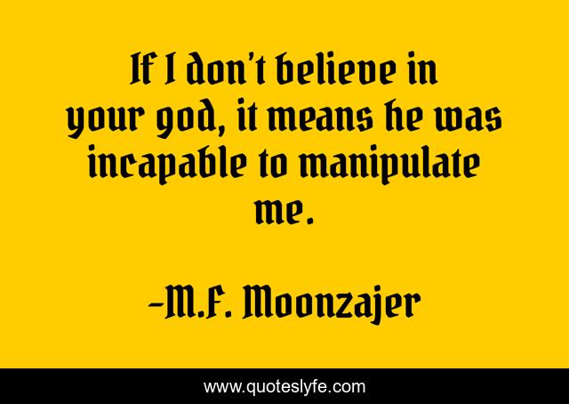 This page presents the quote "If I don’t believe in your god, it means he was incapable to manipulate me.". Author of this quote is M.F. Moonzajer. This quote is about means, god, religion, incapable, believe, manipulate,.