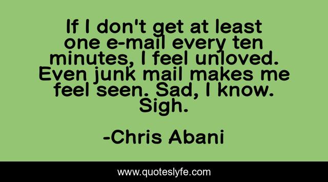 This page presents the quote "If I don't get at least one e-mail every ten minutes, I feel unloved. Even junk mail makes me feel seen. Sad, I know. Sigh.". Author of this quote is Chris Abani. This quote is about me, feel,.