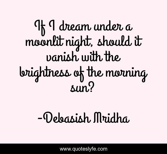 This page presents the quote "If I dream under a moonlit night, should it vanish with the brightness of the morning sun?". Author of this quote is Debasish Mridha. This quote is about brightness-of-the-morning-sun, moonlit-night, philosophy, debasish-mridha, quotes, inspirational, enthusiasm, dream, debasish-mridha-m-d,.