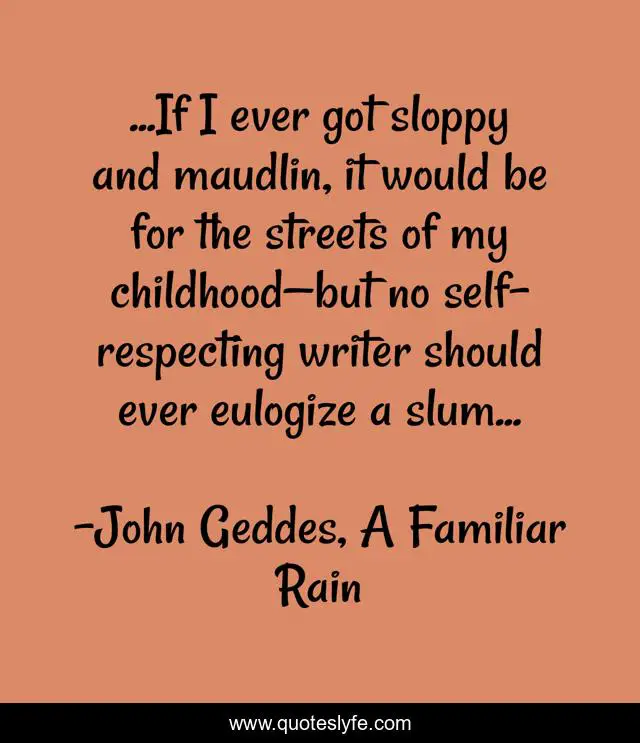 This page presents the quote "...If I ever got sloppy and maudlin, it would be for the streets of my childhood—but no self- respecting writer should ever eulogize a slum...". Author of this quote is John Geddes, A Familiar Rain. This quote is about eulogy, writer, muse, streets, maudlin, slum, childhood-memories,.