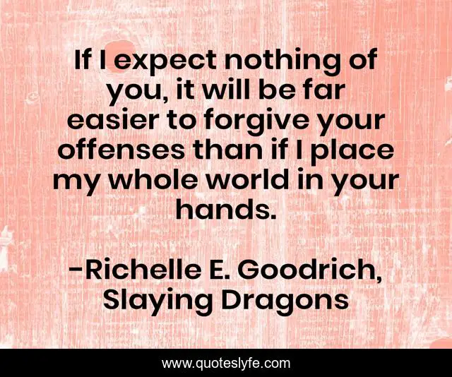 This page presents the quote "If I expect nothing of you, it will be far easier to forgive your offenses than if I place my whole world in your hands.". Author of this quote is Richelle E. Goodrich, Slaying Dragons. This quote is about offenses, richelle-e-goodrich, forgiveness, expectations, richelle, richelle-goodrich, forgiving, trust, expecting-nothing,.