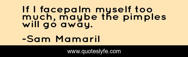 This page presents the quote "If I facepalm myself too much, maybe the pimples will go away.". Author of this quote is Sam Mamaril. This quote is about anger, face, humor, tease,.