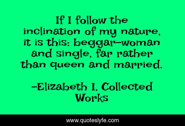 This page presents the quote "If I follow the inclination of my nature, it is this: beggar-woman and single, far rather than queen and married.". Author of this quote is Elizabeth I, Collected Works. This quote is about bachelorhood, dignity, empowerment, self-determination, singles, freedom, matrimony, independence, marriage,.