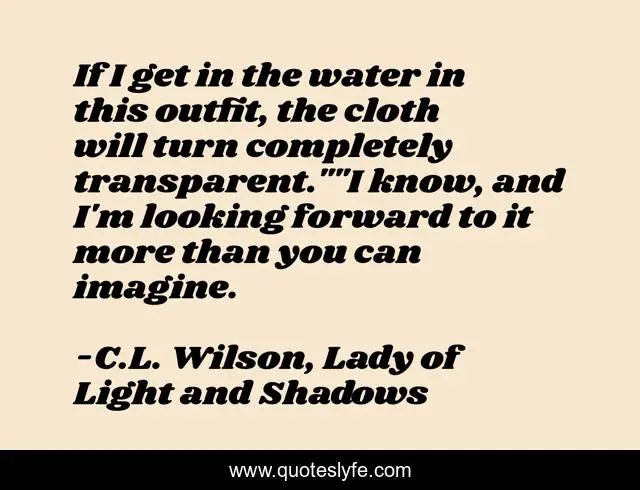 This page presents the quote "If I get in the water in this outfit, the cloth will turn completely transparent.""I know, and I'm looking forward to it more than you can imagine.". Author of this quote is C.L. Wilson, Lady of Light and Shadows. This quote is about wizards, magic, epic-romantic-fantasy, fae,.