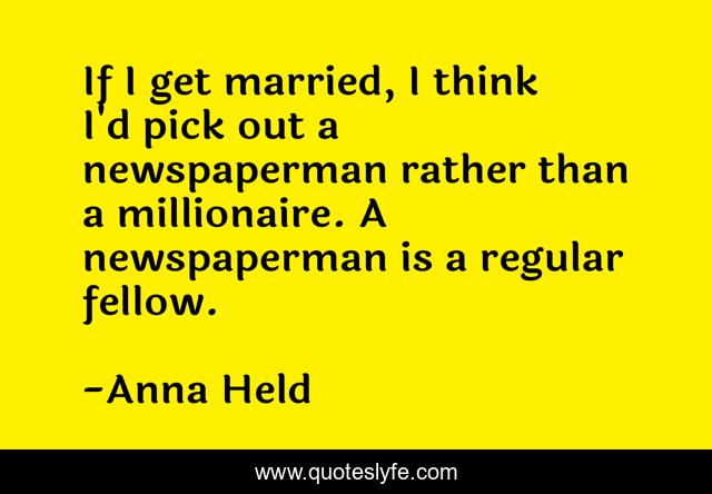 This page presents the quote "If I get married, I think I'd pick out a newspaperman rather than a millionaire. A newspaperman is a regular fellow.". Author of this quote is Anna Held. This quote is about married, think, millionaire,.