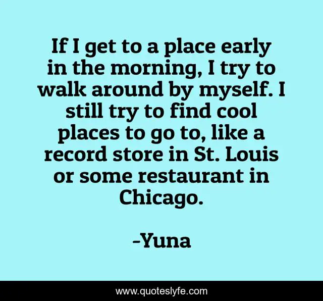 This page presents the quote "If I get to a place early in the morning, I try to walk around by myself. I still try to find cool places to go to, like a record store in St. Louis or some restaurant in Chicago.". Author of this quote is Yuna. This quote is about myself, cool, walk,.
