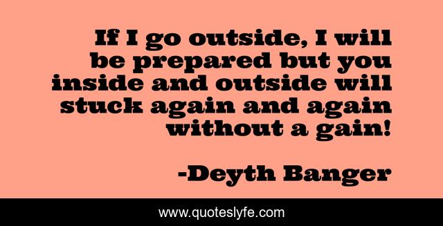 This page presents the quote "If I go outside, I will be prepared but you inside and outside will stuck again and again without a gain!". Author of this quote is Deyth Banger. This quote is about be, i, inside, but, prepared, outside, gain,.