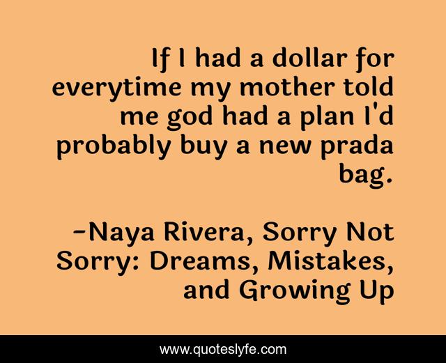 This page presents the quote "If I had a dollar for everytime my mother told me god had a plan I'd probably buy a new prada bag.". Author of this quote is Naya Rivera, Sorry Not Sorry: Dreams, Mistakes, and Growing Up. This quote is about god-s-plan, god, humor, plan,.