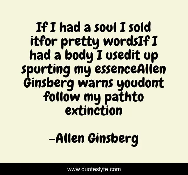 This page presents the quote "If I had a soul I sold itfor pretty wordsIf I had a body I usedit up spurting my essenceAllen Ginsberg warns youdont follow my pathto extinction". Author of this quote is Allen Ginsberg. This quote is about allen-ginsberg, beat, poetry, poet,.