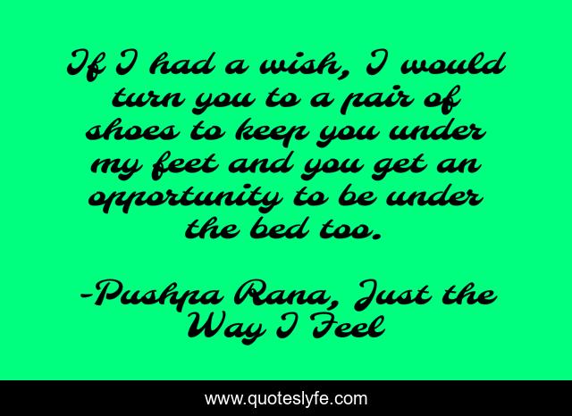 This page presents the quote "If I had a wish, I would turn you to a pair of shoes to keep you under my feet and you get an opportunity to be under the bed too.". Author of this quote is Pushpa Rana, Just the Way I Feel. This quote is about love, shoes, under-the-bed, feet, hate, affection,.