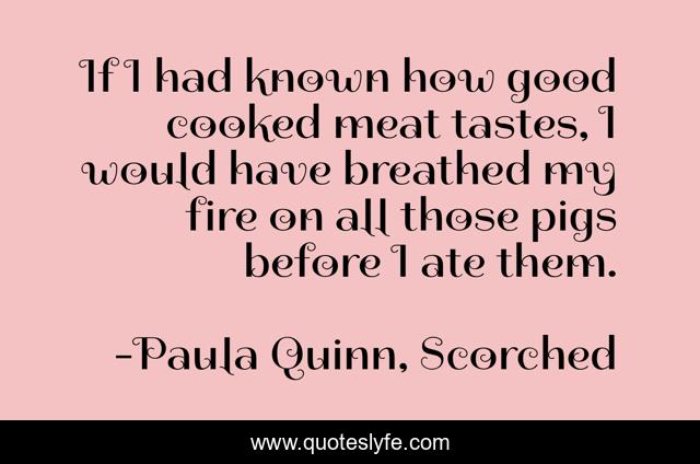 This page presents the quote "If I had known how good cooked meat tastes, I would have breathed my fire on all those pigs before I ate them.". Author of this quote is Paula Quinn, Scorched. This quote is about romance, dragon, dragons, dragons-romance, dragonshifters,.
