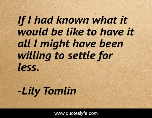 This page presents the quote "If I had known what it would be like to have it all I might have been willing to settle for less.". Author of this quote is Lily Tomlin. .