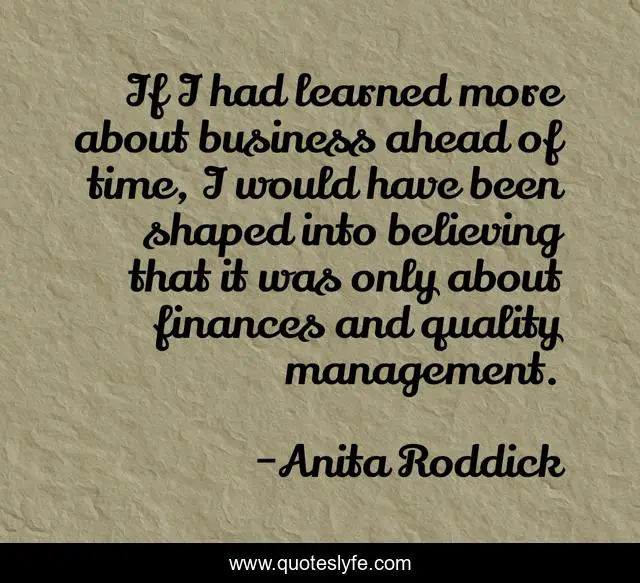 This page presents the quote "If I had learned more about business ahead of time, I would have been shaped into believing that it was only about finances and quality management.". Author of this quote is Anita Roddick. This quote is about management, business, time,.