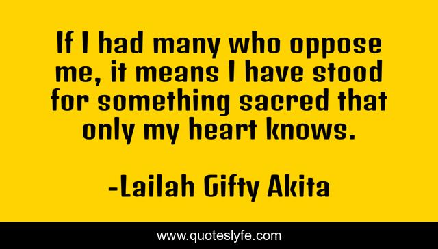 This page presents the quote "If I had many who oppose me, it means I have stood for something sacred that only my heart knows.". Author of this quote is Lailah Gifty Akita. This quote is about enemy, lailah-gifty-akita-affirmations, strong-woman, inspirational, opposition, enthusiasm, conflict,.