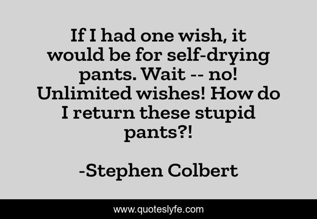 This page presents the quote "If I had one wish, it would be for self-drying pants. Wait -- no! Unlimited wishes! How do I return these stupid pants?!". Author of this quote is Stephen Colbert. This quote is about twitter, wishes, humour, pants,.