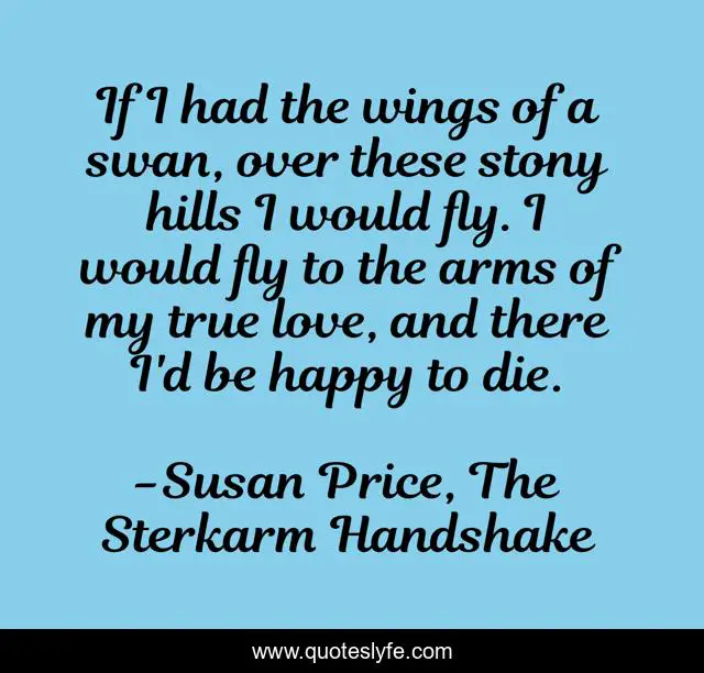 This page presents the quote "If I had the wings of a swan, over these stony hills I would fly. I would fly to the arms of my true love, and there I'd be happy to die.". Author of this quote is Susan Price, The Sterkarm Handshake. .