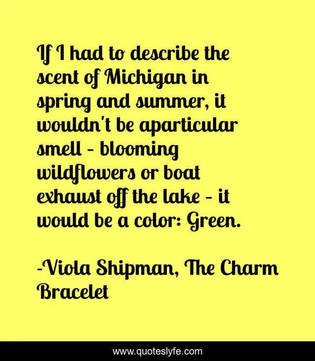 This page presents the quote "If I had to describe the scent of Michigan in spring and summer, it wouldn't be aparticular smell – blooming wildflowers or boat exhaust off the lake – it would be a color: Green.". Author of this quote is Viola Shipman, The Charm Bracelet. This quote is about summer, michigan-authors, michigan, lake, springtime, wildflowers,.