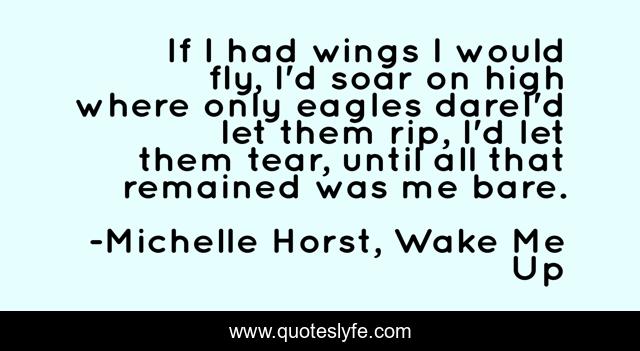 This page presents the quote "If I had wings I would fly, I'd soar on high where only eagles dareI'd let them rip, I'd let them tear, until all that remained was me bare.". Author of this quote is Michelle Horst, Wake Me Up. This quote is about fly, seeking, freedom, hopeful, escape, eagles, soar,.