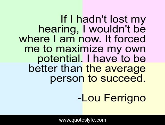 This page presents the quote "If I hadn't lost my hearing, I wouldn't be where I am now. It forced me to maximize my own potential. I have to be better than the average person to succeed.". Author of this quote is Lou Ferrigno. This quote is about self-awareness, deafness, deaf, potential, self-improvement, self-confidence,.
