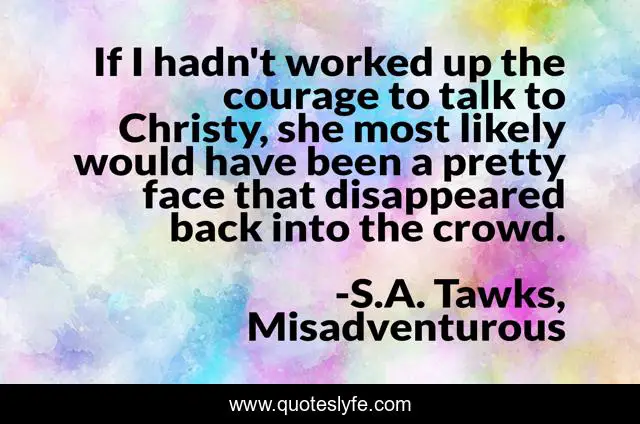 This page presents the quote "If I hadn't worked up the courage to talk to Christy, she most likely would have been a pretty face that disappeared back into the crowd.". Author of this quote is S.A. Tawks, Misadventurous. This quote is about australia, brisbane, crime, adventure, queensland, adventurous,.